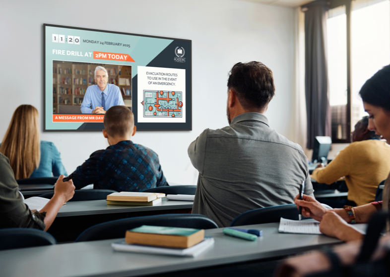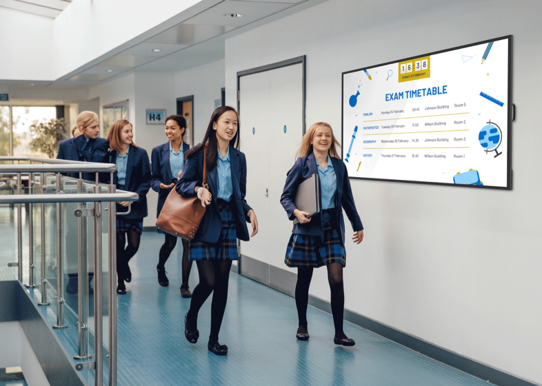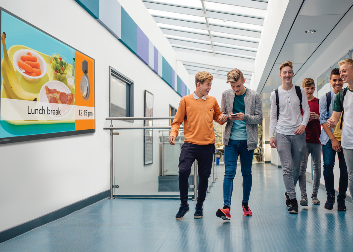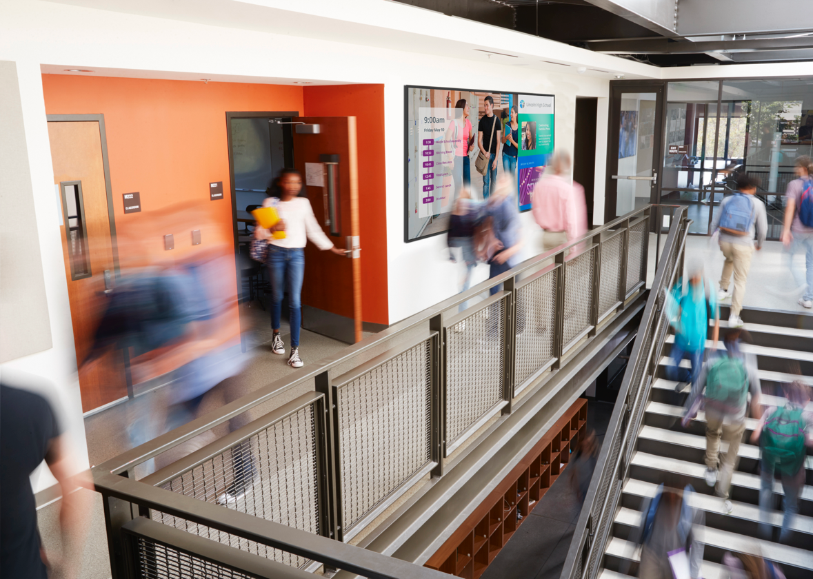 Reinforce wayfinding, event info and daily communications without interrupting class
