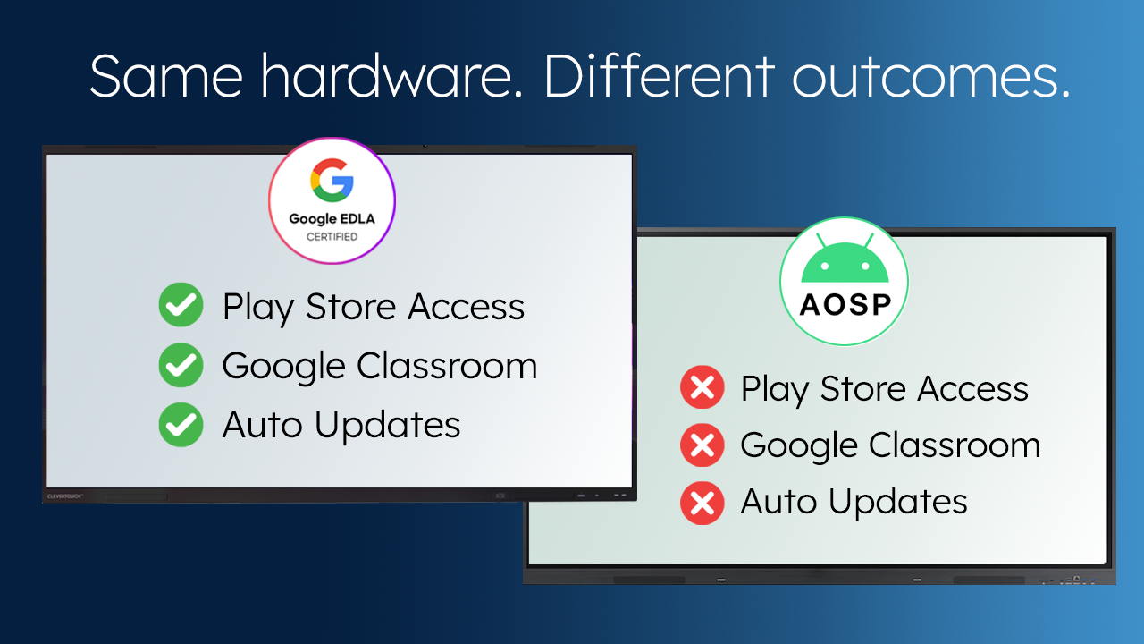 The district IT team investigates and learns the vendor saved costs by shipping the panel with AOSP (Android Open Source Project) rather than Google EDLA certification. The display runs Android, technically, but it cannot access the Google Play Store, Google Classroom integration, or automatic security updates.